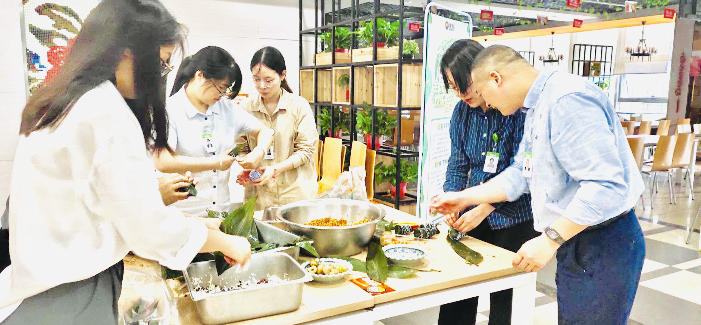 在圣奥中央大厦、海康威视、圣奥大江东、顺网科技门店,工作人员精心准备了各种馅料,在餐厅里临时成立了教学台,现场教大家包端午粽。